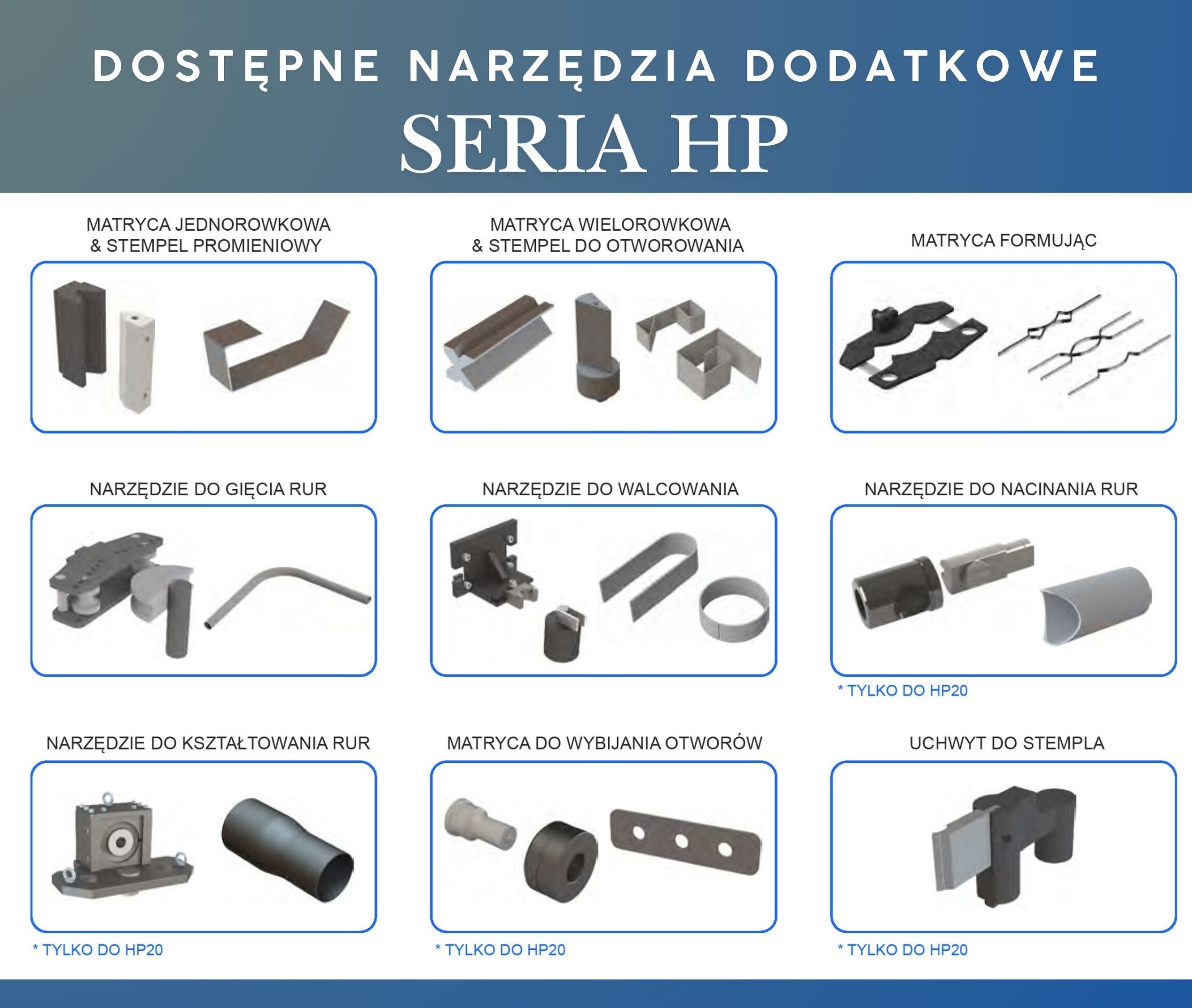 Hydrauliczne prasy poziome Tubend serii HP umożliwiają łatwe wykonywanie wszelkich operacji, takich jak gięcie, cięcie, dziurkowanie, kształtowanie rur, profili kwadratowych, blach przy użyciu standardowych lub specjalnych narzędzi.